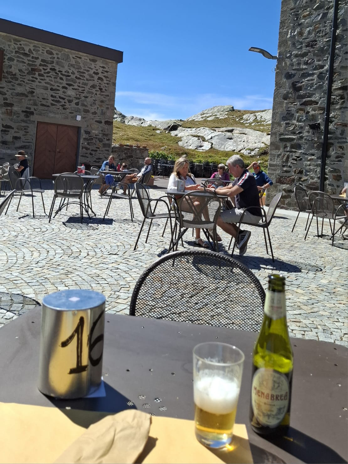 Na deze schitterende maar wel heel intensieve reis, bij temperaturen van wel 37 graden, was het heerlijk die laatste dag in het zonnetje boven op de Bernhardpas te zitten. Met een biertje onder handbereik en in de wetenschap bijna thuis te zijn.