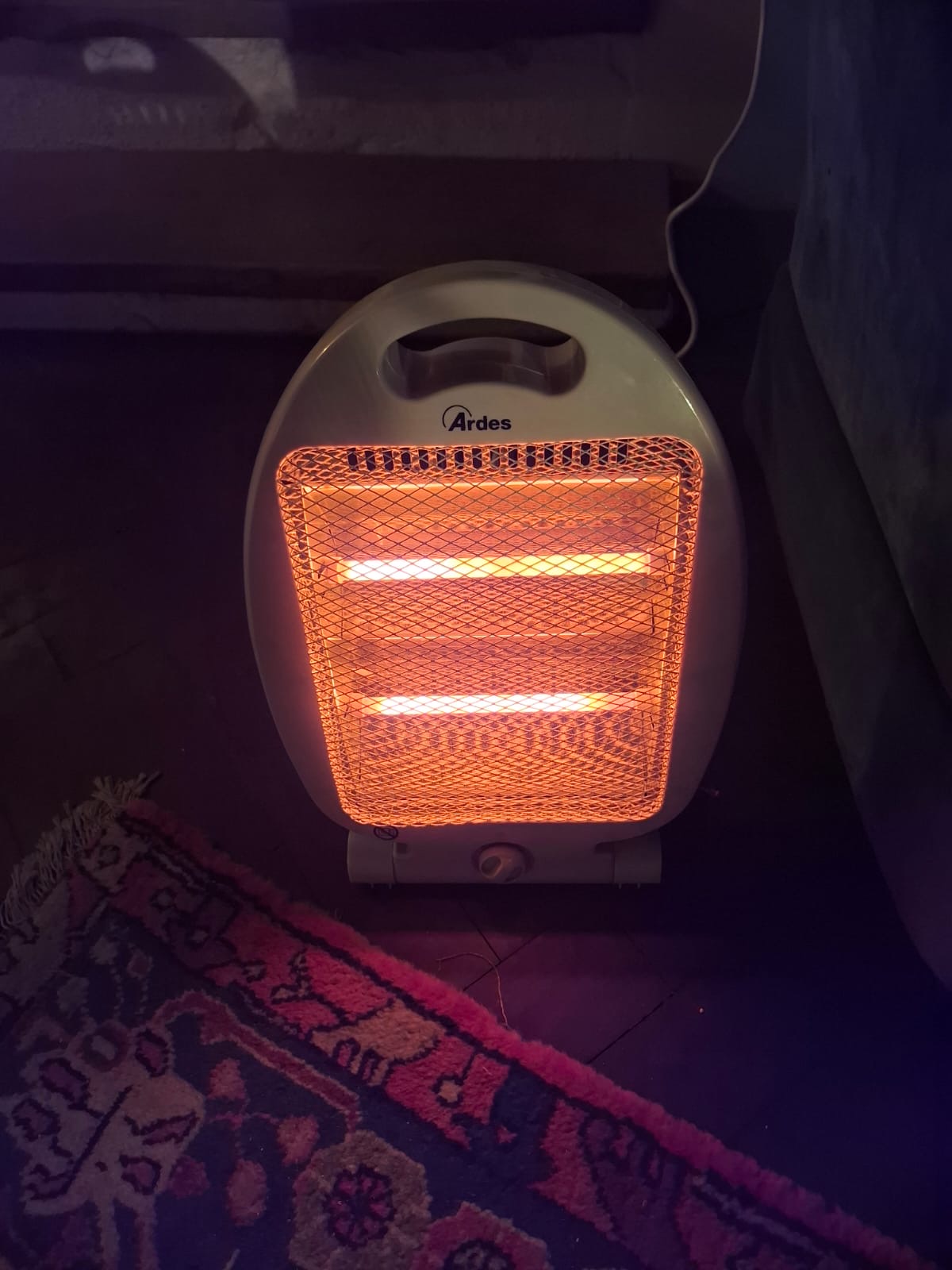 In de zitkamer staat de tv en daar is het ijskoud. Sinds kort heb ik daar 's avonds een elektrisch kacheltje aan staan wat de ergste kou verdrijft. Gehuld in één van mama's plaids kijk ik er tv. De radiatoren blijven koud want cv is hier niet te betalen.